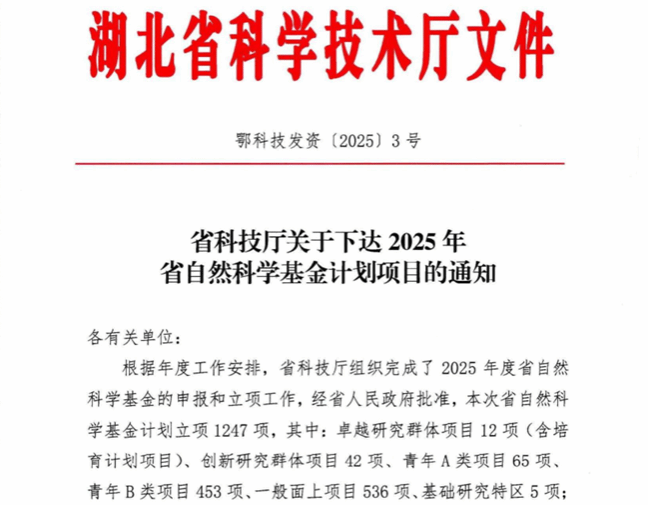 近日,湖北省科技厅印发《关于下达2025年省自然科学基金计划项目的通知》(鄂科技发资〔2025〕3号),公布获批立项的2025年湖北省自然科学基金各类项目。英国正版365刘国亮教授申报的“二氧化碳催化转化”项目成功获批青年A类项目,这是刘国亮教授在可持续能源催化领域深耕多年取得的又一重要科研突破。