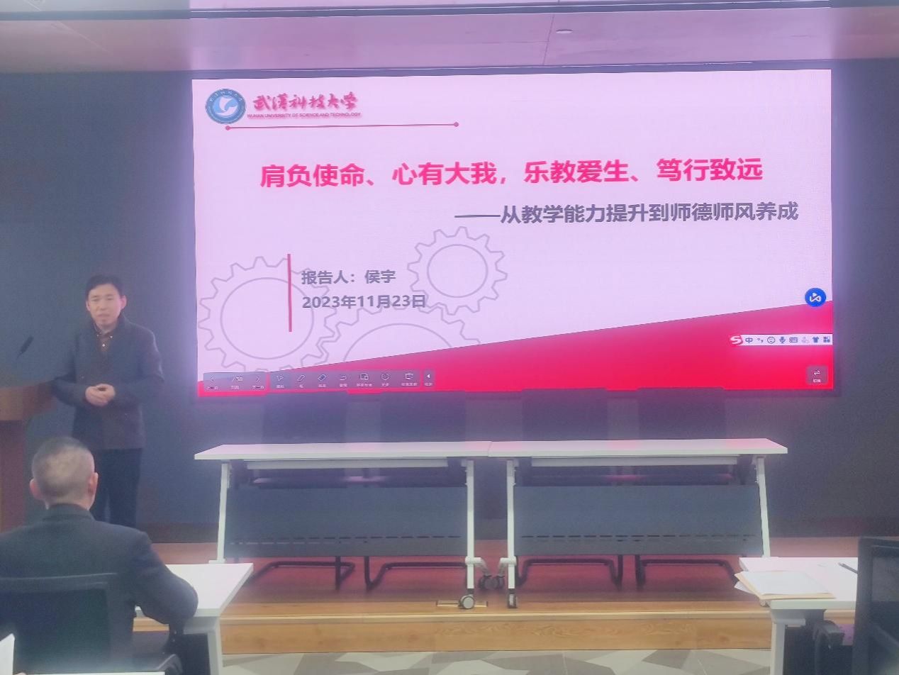 首先,公司机械公司侯宇教授以《肩负使命、心有大我,乐教爱生、笃行致远——从教学能力提升到师德师风养成》为题作专题报告,分别从上好课:打造高效活力课堂、做研究:锤炼教学综合能力、求突破:走出教学的舒适区和铸名师:做人民满意的好老师这四个方面解读了2023年9月在全国优秀教师座谈会上习近平总书记提出的“中国特有的教育家精神”,并寄语在座每一名教师做“三寸粉笔,三尺讲台系国运;一颗丹心,一生秉烛铸民魂”的好老师。