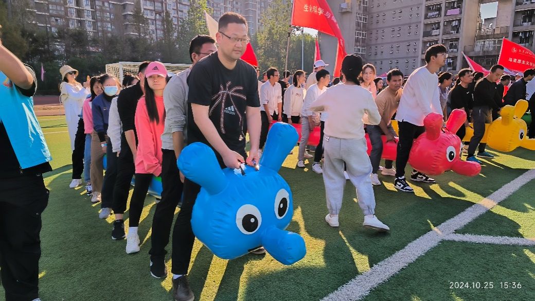 四个集体混合项目中,分工会主席曲玉琴和党委副书记余婷也亲自上阵参与到团体竞赛项目中,与参赛老师一起斗志昂扬、奋力拼搏。漫步红地毯项目中,李飞和李江江两位老师一前一后一甩一递,配合默契,其他队员轻巧跳跃,像石榴籽一样紧紧抱成一团。非凡的团队协作能力使我们取得了第一名的优异成绩。