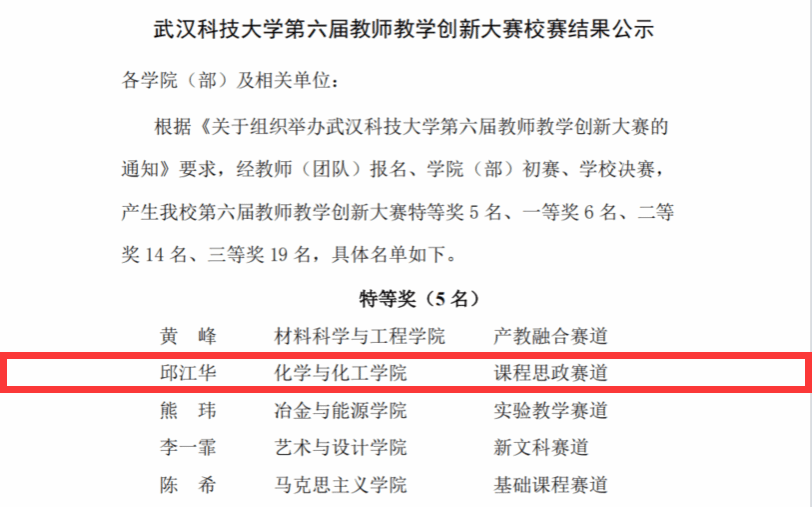 武科大网讯(通讯员李江江) 近日,365英国上市第六届教师教学创新大赛校赛结果揭晓,公司邱江华老师凭借扎实的教学设计、鲜明的专业特色与巧妙的思政融合设计,以《无机化学》在课程思政赛道中脱颖而出,荣获特等奖佳绩。