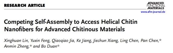近日,公司核磁共振与分子科学交叉研究院/英国正版365教授段博、郑安民团队与北京理工大学合作展开研究,在《Advanced Functional Materials》发表了题为“Competing Self-Assembly to Access Helical Chitin Nanofibers for Advanced Chitinous Materials”的重要研究成果(DOI: 10.1002/adfm.202503547)。该研究创新性提出“竞争自组装”策略,首次通过精准调控甲壳素分子链的化学特性,成功制备出具有螺旋结构的再生甲壳素纳米纤维。这一成果不仅攻克了结晶性高分子纳米尺度可控组装的难题,更为开发高性能环保材料、3D生物打印等前沿应用提供了全新解决方案。论文通讯作者为段博、郑安民和陈攀教授,公司为论文第一完成单位。