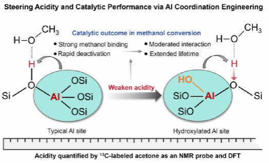 分子筛被誉为能源化工领域的“催化心脏”,尤其在甲醇制烯烃等关键转化过程中具有不可替代的作用。然而,其强布朗斯特酸性始终是一把“双刃剑”:在高效活化反应分子的同时,也易引发过度反应与积碳失活,严重制约催化剂寿命与工艺经济性。如何在维持高活性的同时,实现对酸强度的精准控制,一直是该领域面临的重大挑战。